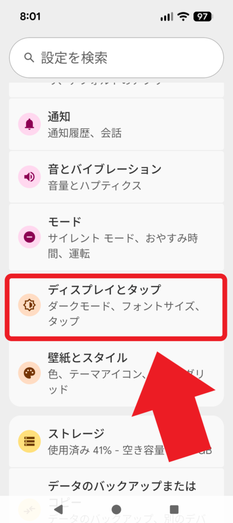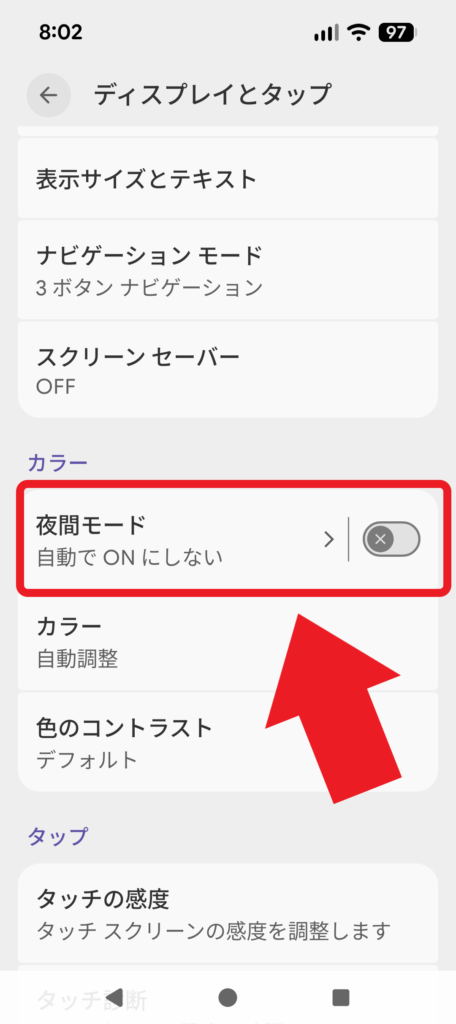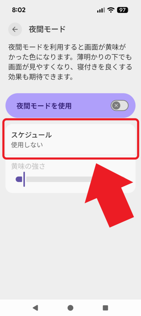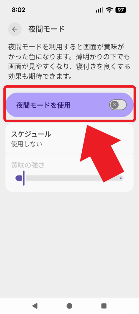 Androidに搭載されている「夜間モード」は、寝る前のスマホ使用時に目に負担がかかりにくいよう、ブルーライトを抑えてくれる機能です。