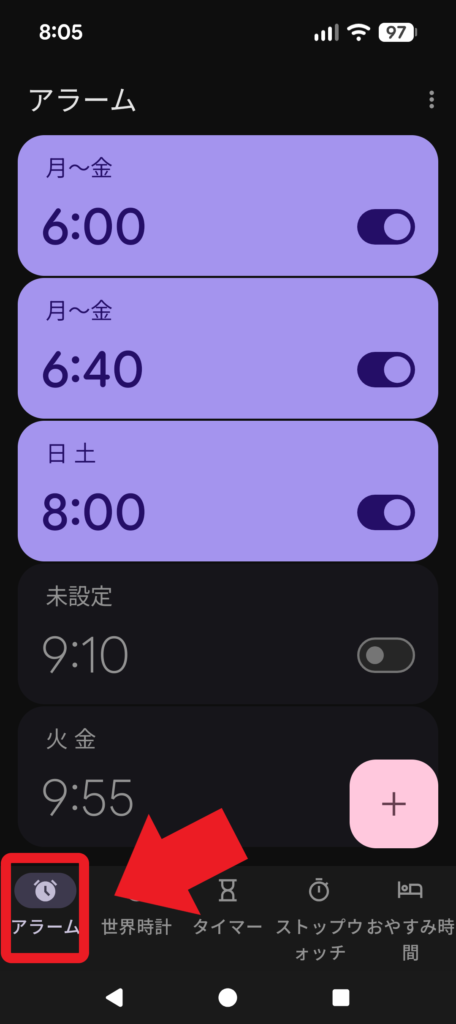 おやすみ時間モードの設定をした時点で自動でセットされてしまうので、改めて「時計」アプリからアラームをOFFにしましょう。